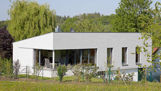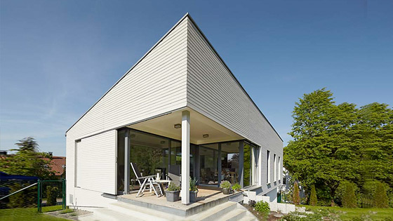 Einfamilienhaus mit flach geneigtem Pultdach, welches sich optimal in das Hanggrundstück einfügt. Die Fassade ist in lasiertem Fichtenholz gehalten. Viele spannende Details, wie der großflächige Schiebeladen, runden das Gesamtbild ab.
